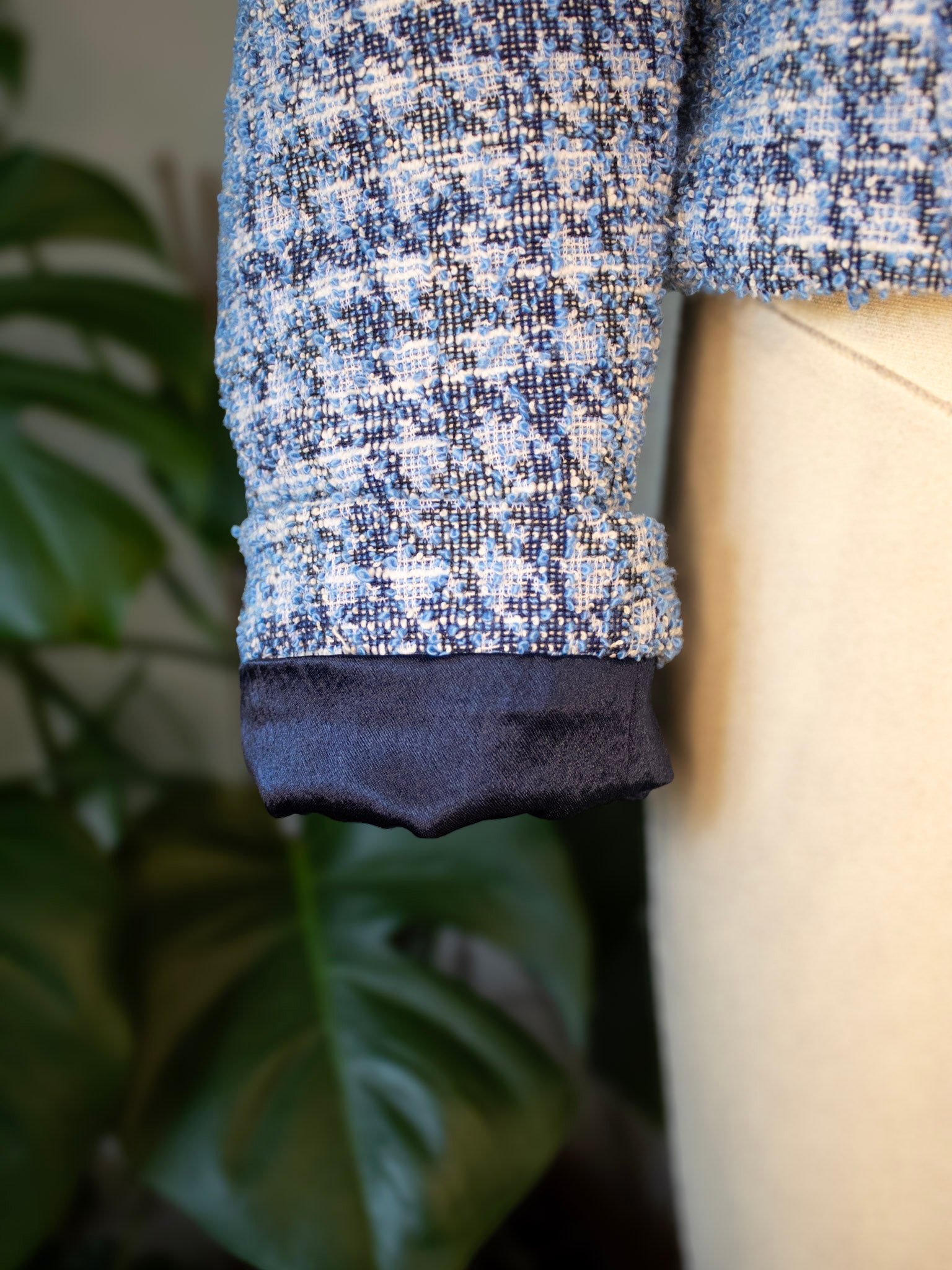 This beautiful blue with hints of white has stunning navy satin lining is made to pin point perfection with immaculate precision down to the smallest detail. If your looking for a jacket to throw over top of a dress for a party or looking to stay casual this jacket is perfect for every occasion.